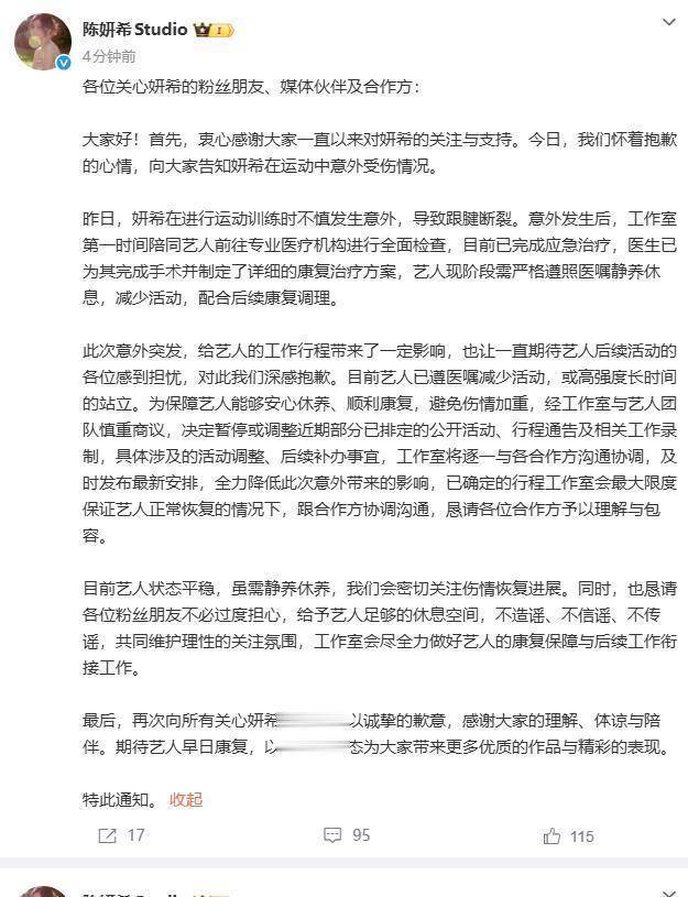 为保险艺东说念主概况释怀休养、获胜康复,幸免伤情加剧,经职责室与艺东说念主团队庄重询查,决定暂停或调整近期部分已排定的公开活动、行程文书及商量职责录制,具体波及的活动调整、后续补就业宜,职责室将一一与各协作方交流融合,实时发布最新安排,全力镌汰这次不测带来的影响,已笃定的行程职责室会最大抵制保证艺东说念主普遍收复的情况下,跟协作方融合交流,恳请诸君协作方给予意会与包容。