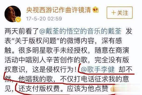 自后搭档岳云鹏演唱许镜清的《男儿情》,他躬行给许镜清打电话征求倡导,并支付了版权费。过后许镜清特殊发文,大赞李健的这一转为。