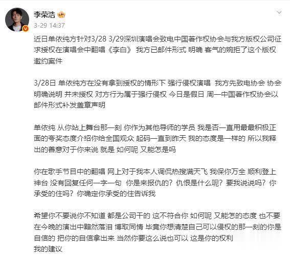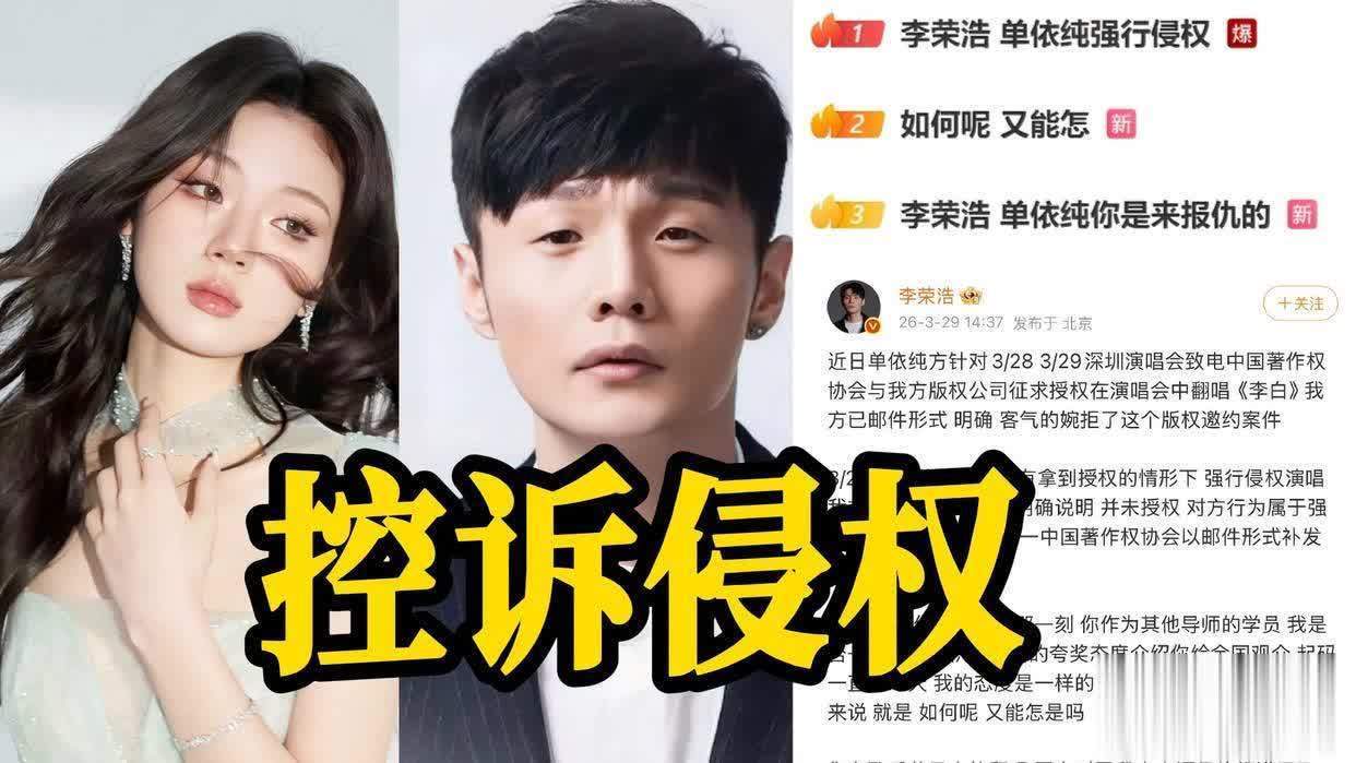 近日,李荣浩因单依纯在演唱会未经授权翻唱其作品《李白》一事,躬行下场维权激发全网体恤。