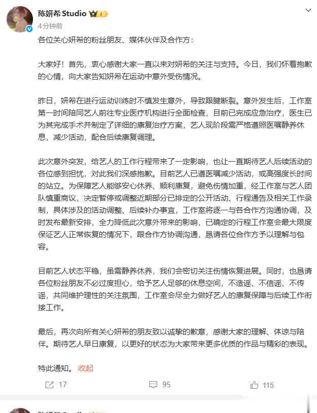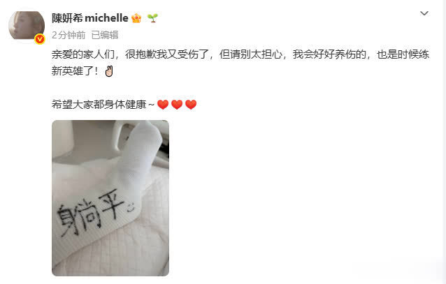 随后陈妍希发文:亲爱的家东说念主们,很对不起我又受伤了,但请别太回来,我会好好养伤的,亦然时候练新英杰了!但愿环球皆体魄健康~