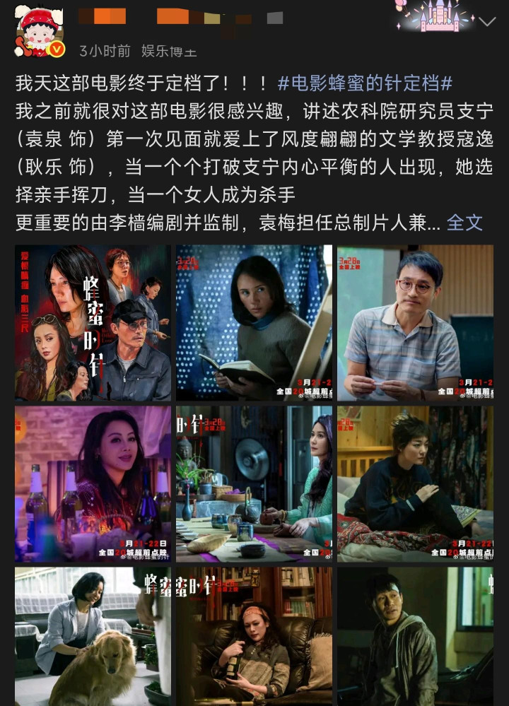问题也就在这儿,期待和成片足够不是一趟事。3月28日上映后,《蜂蜜的针》首日票房372万,排片却有12.6%。排片不算低,票房却只排到第六,这就也曾很线路问题了。自后两天累计633万,业内瞻望的最终票房也不到1700万。