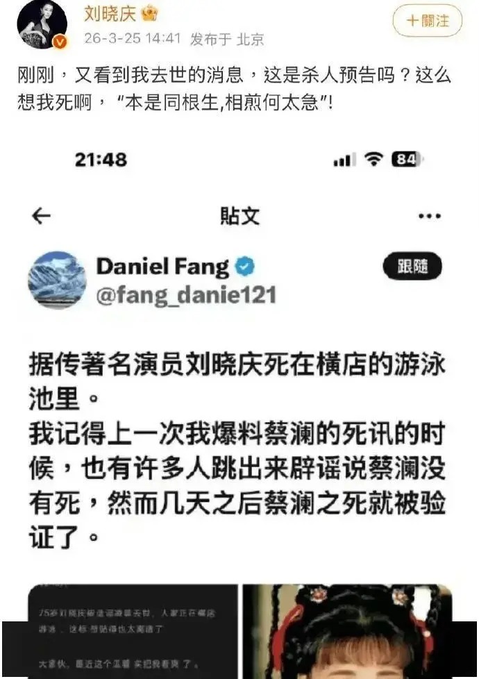 这事最近闹得沸沸扬扬,75岁的刘晓庆公开声称,我方被传死在横店游池塘,降低的账号“Daniel Fang”背后,竟是她养育了四十多年的外甥靖然。她可不是证据简直,还贴出了聊天纪录截图,上头明确写着“14:56是我的外甥靖然”,何况默示“我查过他”。截图未作打码治理,发布时显得颇为决绝。